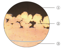 2. 铜粉层,0.20-0.35mm,提高PTFE混合物与铜板层的结合强度,具有很好的承载能力和耐磨性。较高的导热系数可迅速转移运作过程产生的热量。